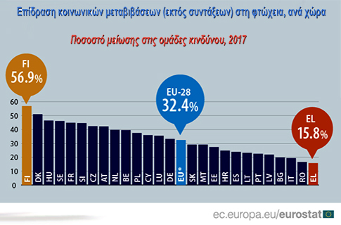 Τα στοιχεία της Eurostat είναι αποκαλυπτικά για την ανεπάρκεια της κοινωνικής πολιτικής, η οποία οδηγεί – εκτός των άλλων – σε μείζονα προβλήματα υγείας. Οι ειδικοί του Οργανισμού κατέγραψαν την επίδραση των κοινωνικών παροχών (πλην συντάξεων) το 2017 ως προς τη μείωση του κινδύνου φτώχειας.