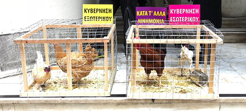 Κατά τη συγκέντρωσή τους στο υπουργείο Υγείας, οι εργαζόμενοι τοποθέτησαν στην είσοδο κλουβιά με κότες και κοκόρια, με αιχμές για την πολιτική της κυβέρνησης.