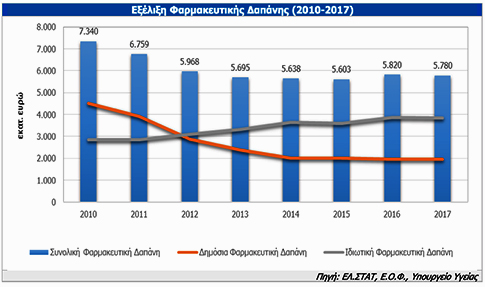 Αντίστοιχα, η ιδιωτική φαρμακευτική δαπάνη εμφάνιζε μειοψηφική συμμετοχή επί της συνολικής φαρμακευτικής δαπάνης, την περίοδο 2007 - 2011. Την περίοδο 2012 - 2015, διευρύνθηκε με έντονο ρυθμό, με συνέπεια το 2016 να ανέλθει σε 3.875 εκατομμύρια ευρώ, ενώ το 2017 διαμορφώθηκε σε 3.835 εκατομμύρια.
