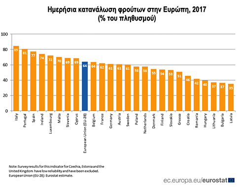 Συγκεκριμένα, μόνο το 51% των Ελλήνων καταναλώνουν φρούτα σε καθημερινή βάση (μέσο ευρωπαϊκό ποσοστό 64%) και το 60% λαχανικά (μέσο ποσοστό στην Ευρώπη 64%).