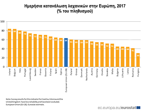 Ως προς τα λαχανικά, η Ιρλανδία και το Βέλγιο εμφανίζουν τις υψηλότερες καταναλώσεις, με το 84% των δύο λαών να τρώνε τουλάχιστον μία φορά την ημέρα, με τρεις χώρες να έχουν ποσοστό κάτω από 50%: η Ουγγαρία (30%), η Ρουμανία (41%), η Λετονία (44%), Λιθουανία και η Βουλγαρία (45%).