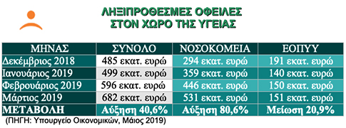 Στο τέλος του 2018, οι οφειλές νοσοκομείων και ΕΟΠΥΥ ανέρχονταν σε 485 εκατομμύρια ευρώ, ποσό που εκτινάχθηκε στα 682 εκατομμύρια τον περασμένο Μάρτιο.