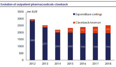 Το clawback για τα φαρμακευτικά προϊόντα, ειδικά για τους εξωτερικούς ασθενείς, αυξάνεται χρόνο με τον χρόνο (παρακάτω πίνακας) και το 2018 υπερβαίνει τα 550 εκατομμύρια ευρώ, από τα 79 εκατομμύρια το 2012.