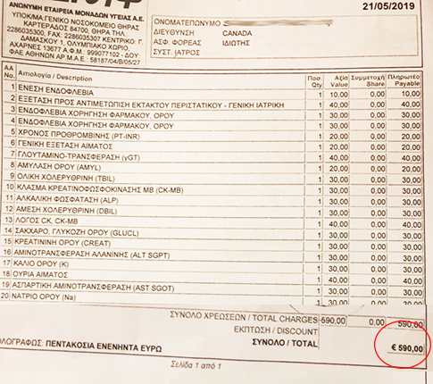 Όπως προκύπτει από απόδειξη, που παρατίθεται πιο κάτω, Καναδός τουρίστας χρεώθηκε με 590 ευρώ, για μία σειρά από απλές ιατρικές εξετάσεις, οι οποίες θα κόστιζαν πολύ λιγότερο ακόμη και σε ιδιωτικό θεραπευτήριο.