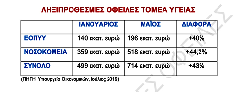 Από την ανάγνωση των στοιχείων φαίνεται μία αξιόλογη αύξηση των οφειλών του τομέα της Υγείας, η οποία εντείνεται όσο πλησιάζουμε στις εκλογές.