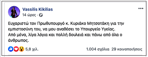 "Ευχαριστώ τον Πρωθυπουργό κ. Κυριάκο Μητσοτάκη για την εμπιστοσύνη του, να μου αναθέσει το Υπουργείο Υγείας.