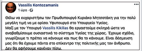 Βασίλης Κικίλιας και Βασίλης Κοντοζαμάνης ανάρτησαν στο Facebook από ένα σύντομο σχόλιο σχετικά με την ανάληψη των καθηκόντων τους.