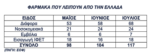 Από τον Μάιο έως τον Ιούλιο, τα σκευάσματα που βρίσκονταν σε μακροχρόνια έλλειψη από την ελληνική αγορά αυξήθηκαν κατά 20%, φτάνοντας τον περασμένο μήνα τα 117, έναντι 98 τον Μάιο.