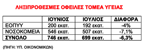 Οι οφειλές νοσοκομείων και ΕΟΠΥΥ ανήλθαν στα 699 εκατομμύρια ευρώ, έναντι 746 εκατομμυρίων τον Ιούνιο και 499 εκατομμυρίων τον Ιανουάριο.