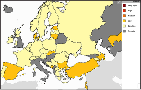 Οι αρμόδιοι του ECDC έχουν δώσει στη δημοσιότητα τον παραπάνω χάρτη, στον οποίο αποτυπώνεται η συχνότητα καταγραφής κρουσμάτων γρίπης στη Γηραιά Ήπειρο.