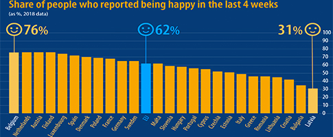 Στον αντίποδα, οι πιο δυστυχείς πολίτες φαίνεται πως ζουν στη Λετονία, όπου το 31% δηλώνουν χαρούμενοι τις περισσότερες φορές. Οριακά καλύτερα είναι η εικόνα στη Βουλγαρία (35%), στην Κροατία (42%), στη Λιθουανία (45%), στην Ελλάδα και στη Ρουμανία (46%).