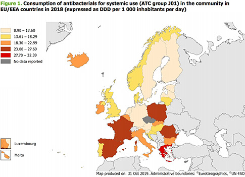 -Tο ECDC (Ευρωπαϊκό Κέντρο Πρόληψης και Ελέγχου Νοσημάτων) καταγράφει σχεδόν διπλάσια χρήση αντιβιοτικών στη χώρα μας, σε σύγκριση με τον μέσο όρο που ισχύει στην Ε.Ε.