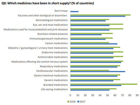 Γαλλία: Τον Ιούλιο του 2019, 800 φαρμακοποιοί ανέφεραν ότι ένα φάρμακο δεν ήταν διαθέσιμο για περισσότερο από 72 ώρες. Οι μισές ελλείψεις διήρκεσαν 60 ημέρες ή και περισσότερο. Μολονότι το 2008 παρουσιάζονταν προβλήματα εφοδιασμού της αγοράς με 44 σκευάσματα αυτά αυξήθηκαν σε 438 το 2014 και 538 το 2017.