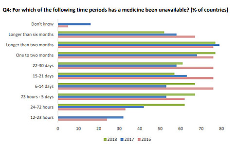 Από 12 ώρες μέχρι και πάνω από έξι μήνες απουσιάζουν από τις αγορές φάρμακα. Οι βραχυπρόθεσμες ελλείψεις (έως και 72 ώρες) έχουν αυξηθεί σημαντικά για τρίτη συνεχή χρονιά, ενώ οι μεσοπρόθεσμες ελλείψεις (73 ώρες έως και δύο μήνες) παρουσιάζουν συγκρίσιμες απαντήσεις στο 2017. Κατά μέσο όρο, ο χρόνος που δαπανούν οι φαρμακοποιοί για την αντιμετώπιση των ελλείψεων εβδομαδιαίως είναι 5,6 ώρες / εβδομάδα.