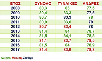 Το διάστημα 2008 – 2017, οι άνδρες εμφανίζουν τα μεγαλύτερα κέρδη σε χρόνο ζωής (1,3 έτος), έναντι των γυναικών (1,1 έτος).