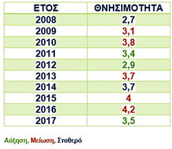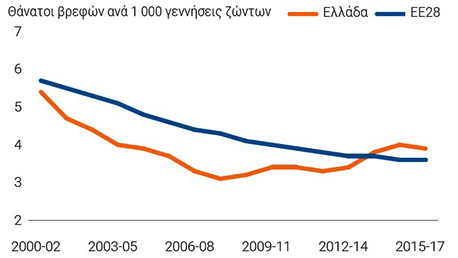 Η μείωσή του στην Ελλάδα – σημειώνουν – έχει αντιστραφεί από το τριετές μέσο επίπεδο των 3,1 ανά 1.000 γεννήσεις ζώντων κατά την περίοδο 2007 -2009, σε 3,9 κατά την περίοδο 2015 - 2017, υπερβαίνοντας τον μέσο όρο της Ευρωπαϊκής Ένωσης.
