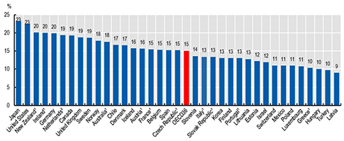 Το μέσο ποσοστό στον ΟΟΣΑ είναι 15%, ενώ κορυφαίες θέσεις στον συγκεκριμένο πίνακα κατέχουν η Σουηδία και η Νορβηγία, όπου το 19% του κρατικού προϋπολογισμού διατίθεται για την περίθαλψη των πολιτών.