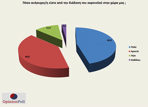 Από τις απαντήσεις που δόθηκαν και φαίνονται στο πιο κάτω γράφημα, φαίνεται πως το 45,8% των ερωτηθέντων ανησυχούν πολύ και το 40,6% ανυσηχούν αρκετά για τη διάδοση του ιού στην Ελλάδα.