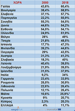 Με εξαίρεση την Εσθονία και τη Λετονία, το σύνολο των χωρών της Ευρωπαϊκής Ένωσης έχουν αυξητική τάση από το 2000.