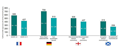 Η Γαλλία και η Αγγλία είχαν συγκρίσιμα ποσοστά έγκρισης (92% και 91%, αντίστοιχα). Ωστόσο, η Γαλλία εξέτασε σχεδόν το διπλάσιο του αριθμού των ορφανών φαρμάκων κατά την περίοδο της ανάλυσης (67 έναντι 35). Ωστόσο, το 19% των ορφανών σκευασμάτων στη Γαλλία έλαβε βαθμολογία V Amelioration du Service Médical Rendu (ASMR) ότι παρέχουν δηλαδή βελτιωμένο ιατρικό όφελος. Τα φάρμακα με βαθμολογία ASMR IV-V αποζημιώθηκαν σε 427 ημέρες, σε σύγκριση με 585 ημέρες για προϊόντα με ASMR I-III (γράφημα 2).