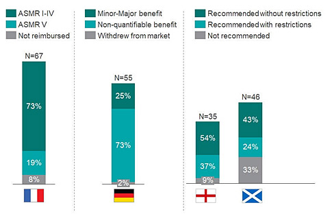Η Γερμανία είχε το υψηλότερο ποσοστό έγκρισης ορφανών φαρμάκων, στο 98%. Ωστόσο, οι περισσότερες από αυτές τις συστάσεις (73%) έχουν λάβει διαβάθμιση πιστοληπτικής ικανότητας «μη μετρήσιμα οφέλη», το οποίο δείχνει η ρυθμιστική αρχή δεν βλέπει κανένα όφελος σε σχέση με τα προϊόντα σύγκρισης (βλέπε γράφημα 1).