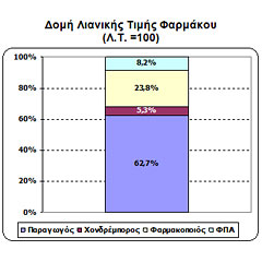 Θα πρέπει καταρχήν να καταστεί σαφές ότι τα στοιχεία του ΕΟΦ αποδίδουν τις συνολικές φαρμακευτικές πωλήσεις, σε λιανικές τιμές οι οποίες περιλαμβάνουν το κέρδος του φαρμακεμπόρου, το κέρδος του φαρμακοποιού και το ΦΠΑ. Συγκεκριμένα, η Λιανική Τιμή ενός φαρμάκου έχει την ακόλουθη δομή:
