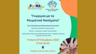 Ενημερωτική Εκδήλωση με τίτλο ''Γνωριμία με τα ρευματικά νοσήματα'' στις ΣέρρεςΘα πραγματοποιηθεί την Τετάρτη 29 Νοεμβρίου στις 17:30.