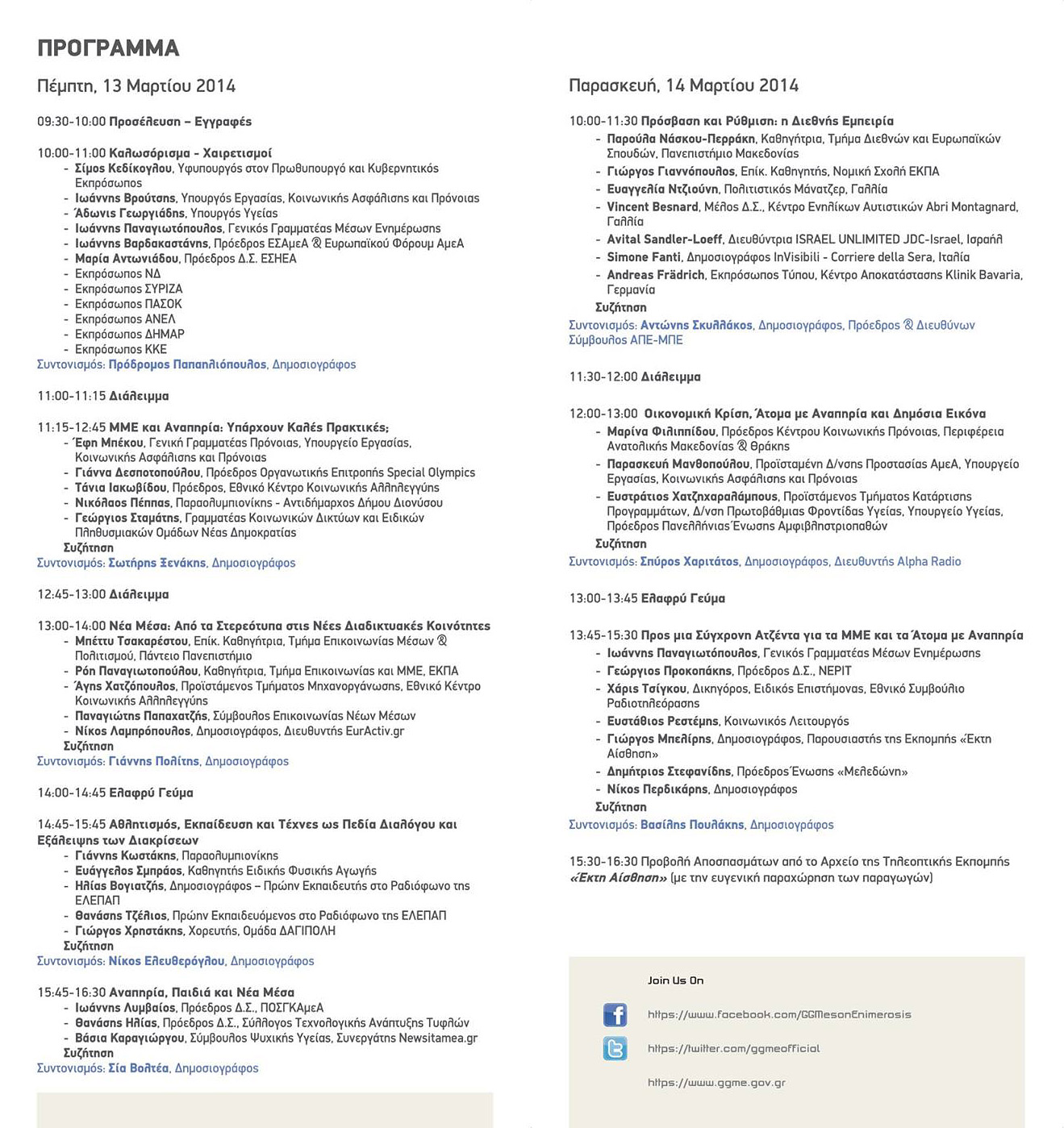 Η Γενική Γραμματεία Μέσων Ενημέρωσης (ΓΓΜΕ) διοργανώνει το 5ο Διεθνές Διήμερο Συνέδριο με θέμα «Άτομα με Αναπηρία και ΜΜΕ – Ενσωμάτωση και Κρίση στην Ψηφιακή Εποχή», την Πέμπτη 13 και Παρασκευή 14 Μαρτίου 2014, με ώρα έναρξης στις 9.30 π.μ.