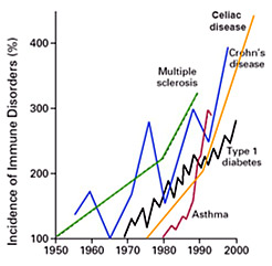 Τα αυτοάνοσα είναι η πρώτη αιτία νόσου στις ανεπτυγμένες χώρες και υπολογίζεται ότι πλήττουν πάνω από 1 στα 5 άτομα. Αυτό σημαίνει ότι αφορούν τουλάχιστον ένα άτομο σε κάθε οικογένεια. Πρόκειται για ασθένειες που εμφανίζουν σταθερά αυξανόμενη συχνότητα τα τελευταία χρόνια, με ποσοστά αύξησης που ξεπερνούν και το 300% για κάποιες από αυτές, όπως η νόσος του Crohn, η σκλήρυνση κατά πλάκας και η κοιλιοκάκη.