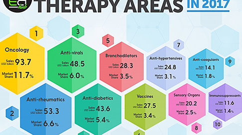 Η ογκολογία διατηρεί την κορυφαία της θέση ως περιοχή θεραπείας καθώς εμφανίζονται νέες και αποτελεσματικές θεραπείες. Έμφαση δίνεται στη γήρανση του πληθυσμού που είναι πιθανότερο να επηρεαστεί από αυτή τη θανατηφόρα ασθένεια. Οι πρόοδοι στη θεραπεία, συμπεριλαμβανομένης της ακτινοβολίας, της χειρουργικής επέμβασης και των θεραπειών φαρμάκων, βοήθησαν τους ασθενείς να ζήσουν περισσότερο. Το 2016, τα συνταγογραφούμενα φάρμακα ογκολογίας και οι πωλήσεις OTC έφτασαν τα 93,7 δισ. δολάρια, με το παγκόσμιο μερίδιο αγοράς στο 11,7%.