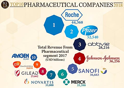 Σύμφωνα με το δημοσίευμα του Igea hub, tο 2017, οι κορυφαίες 10 φαρμακευτικές εταιρείες παγκοσμίως είχαν πωλήσεις ύψους 437,257 δισ. δολαρίων, αντιπροσωπεύοντας περίπου το 40% του παγκόσμιου μεριδίου αγοράς, ενώ οι κορυφαίες 15 φαρμακευτικές εταιρείες παγκοσμίως δημιούργησαν πωλήσεις 568,617 δισεκατομμυρίων δολαρίων, αντιπροσωπεύοντας το 51%.