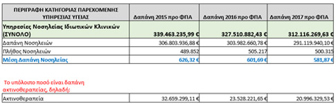 Με βάση τους πίνακες του ΕΟΠΥΥ, το ποσό της δαπάνης ακτινοθεραπείας -που αποτελεί υποκωδικό στις υπηρεσίες νοσηλείας Ιδιωτικών Κλινικών- ήταν 32,6 εκατ. ευρώ το 2015, 23,5 εκατ. ευρώ το 2016 και 20.,9 εκατ. ευρώ το 2017.