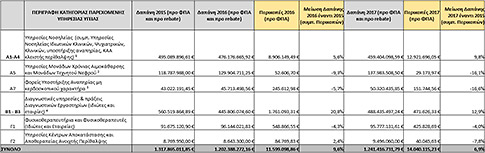 Ακριβώς τα ίδια ισχύουν και στον έτερο πίνακα, όπου παρουσιάζονται τα συγκεντρωτικά στοιχεία της εξέλιξης των δαπανών σε συνάρτηση με τη διαδικασία ελέγχου και εκκαθάρισης Ν. 4368/2016 (ΦΕΚ 21/Α΄/21-2-2016 ) αναφορικά με τις Υπηρεσίες Νοσηλείας ( συμπ. Υπηρεσίες Νοσηλείας Ιδιωτικών Κλινικών, Ψυχιατρικών, Κλινικών, υποστήριξης αναπηρίας, ΚΑΑ κλειστής περίθαλψης), Υπηρεσίες Μονάδων Χρόνιας Αιμοκάθαρσης και Μονάδων Τεχνητού Νεφρού, τους Φορείς Υποστήριξης Αναπηρίας μη κερδοσκοπικού χαρακτήρα, τις Διαγνωστικές υπηρεσίες και πράξεις Διαγνωστικών Εργαστηρίων (ιδιώτες και εταιρίες), Φυσικοθεραπευτήρια και Φυσικοθεραπευτές (Ιδιώτες και Εταιρείες) και Υπηρεσίες Κέντρων Αποκατάστασης και Αποθεραπείας Ανοιχτής Περίθαλψης.