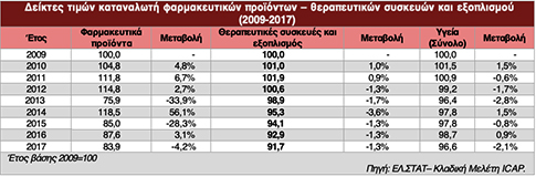 Σε ό,τι αφορά την εξέλιξη των τιμών των προϊόντων που αγοράζουν απευθείας οι καταναλωτές, παρατηρείται μείωση στις τιμές των θεραπευτικών συσκευών και εξοπλισμού από το 2012.