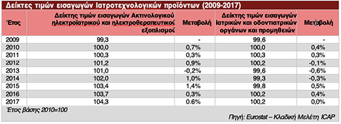 Οι τιμές εισαγωγών για ιατροτεχνολογικό εξοπλισμό καταγράφουν ελαφρά αύξηση την τριετία 2014-2017.