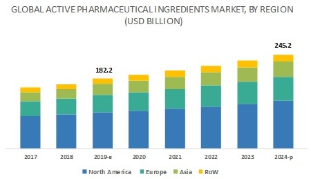 Η Βόρεια Αμερική αναμένεται να αντιπροσωπεύει το μεγαλύτερο μέγεθος της αγοράς κατά την περίοδο πρόβλεψης. Γεωγραφικά, η αγορά ενεργών φαρμακευτικών συστατικών καταμερίζεται στη Βόρεια Αμερική, την Ευρώπη, την Ασία και τον υπόλοιπο κόσμο (RoW). Το 2019, η Β. Αμερική αναμένεται να κυριαρχήσει στην αγορά, ακολουθούμενη από την Ευρώπη. Οι κυριότεροι παράγοντες που οδηγούν στη συνολική ανάπτυξη της αγοράς API στην περιοχή αυτή είναι η αυξανόμενη συχνότητα εμφάνισης χρόνιων ασθενειών που μπορούν να προληφθούν, η αύξηση της επικέντρωσης της κυβέρνησης στα γενόσημα φάρμακα, η αυξανόμενη ζήτηση βιολογικών και ειδικών φαρμάκων και η τεχνολογική πρόοδος στις διαδικασίες παρασκευής των API.