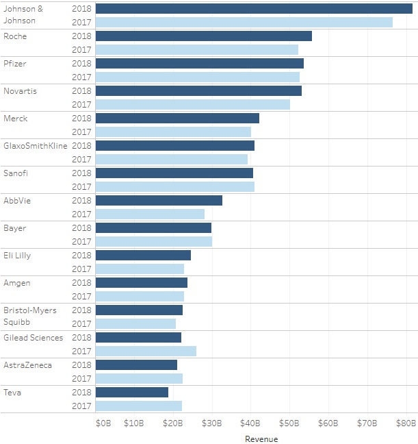 Παρά τη ρευστότητα των εξελίξεων που χαρακτηρίζει τον φαρμακευτικό κλάδο, οι βασικοί παίκτες διατήρησαν και το 2018 το προβάδισμά τους έναντι του ανταγωνισμού καταλαμβάνοντας τις πρώτες θέσεις στην παγκόσμια κατάταξη. Johnson & Johnson, Roche, Pfizer, Novartis και Merck & Co. κατέκτησαν και το 2018 τις 5 υψηλότερες θέσεις στον κλάδο, βάσει των πωλήσεων που πραγματοποίησαν.