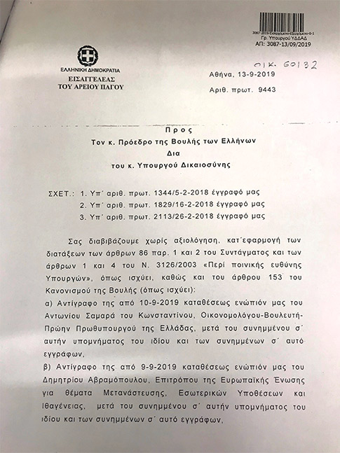 Η δικογραφία που έχει φτάσει στη Βουλή αναφέρεται στον Αλ. Τσίπρα και τον πρώην υπουργό Δ. Παππαγελόπουλο.