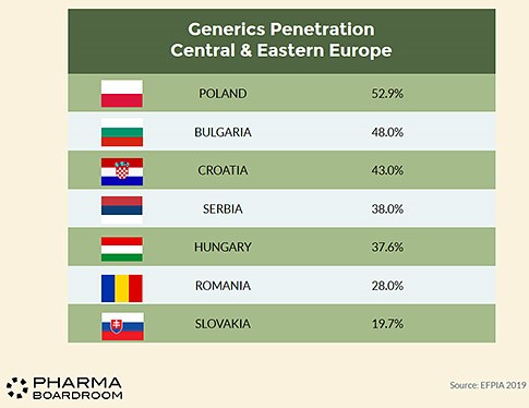 Όσον αφορά τα γενόσημα όπως αποτυπώνεται και στον σχετικό πίνακα η Πολωνία έχει την υψηλότερη διείσδυση γενοσήμων βάσει όγκου, ακολουθούμενη από τη Βουλγαρία. Τα γενόσημα στην Πολωνία καταλαμβάνουν το 52,9% και ακολουθεί η Βουλγαρία με 48%, η Κροατία με 43%, η Σερβία με 38%, η Ουγγαρία με 37,6%, η Ρουμανία με 28% και η Σλοβακία με 19,7%.