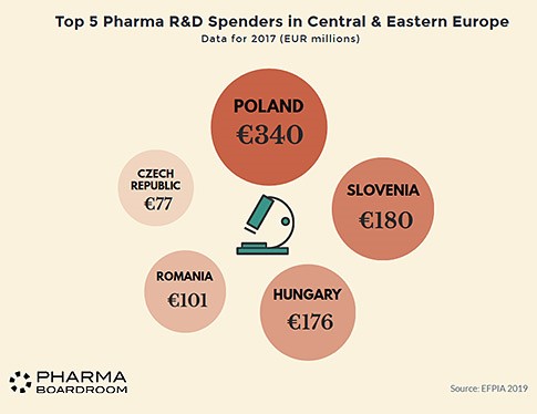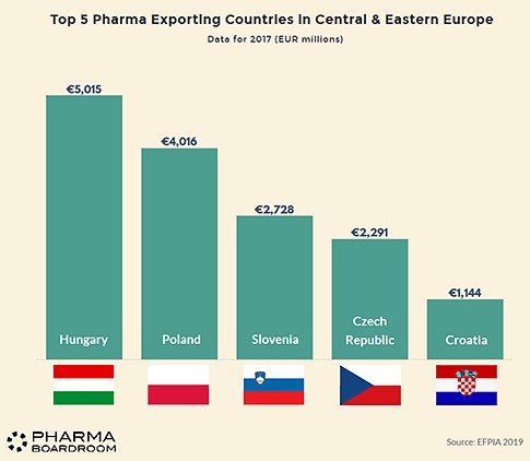Τέλος, η Πολωνία με βάση και τα στοιχεία της Efpia αναδεικνύεται μακράν η μεγαλύτερη φαρμακοβιομηχανία στην περιοχή της Κεντρικής και Ανατολικής Ευρώπης (CEE), συνολικής αξίας 6,352 δισ. Ευρώ για το 2017. Η Τσεχική Δημοκρατία είναι στη δεύτερη θέση, ακολουθούμενη από τη Ρουμανία και την Ουγγαρία.