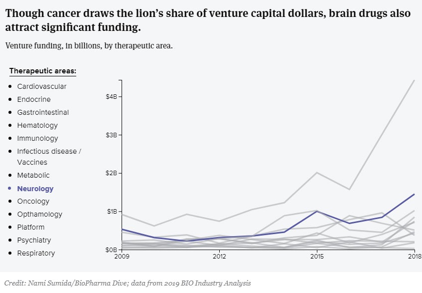 Αυτό, ωστόσο δεν σημαίνει ότι η νευροεπιστήμη δεν απορροφά επενδύσεις. Το 2018 προσέλκυσε 1,5 δισ. δολ., τοποθετώντας τον σχετικό τομέα στη δεύτερη θέση μετά τον καρκίνο βάσει των κονδυλίων που επενδύθηκαν, γεγονός που σημαίνει ότι οι χρηματοδότες αναμένουν αποδόσεις σε σχετικά βραχυπρόθεσμο ορίζοντα.