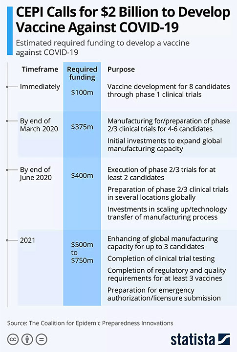 Για να μετριάσουν αυτόν τον κίνδυνο και να ενθαρρύνουν την παραγωγή, οι κυβερνήσεις, η βιομηχανία και οι διεθνείς οργανισμοί συνεργάζονται. Το CEPI, ο Συνασπισμός για τις Επιδημιολογικές Ετοιμότητα Καινοτομίας, ζήτησε επειγόντως χρηματοδότηση 2 δισεκατομμυρίων δολαρίων για τη στήριξη της ανάπτυξης εμβολίων, δοκιμών και ενισχυμένης παραγωγικής ικανότητας. Η Gingko Bioworks δεσμεύτηκε να παρασκευάσει εμβόλια DNA ή RNA. Οι κυβερνητικοί αξιωματούχοι συζητούν επίσης τη χρηματοδότηση.