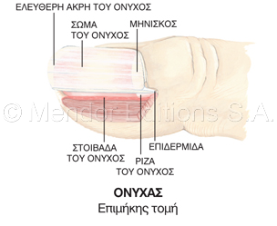 δέρματος των πτυχών των ονύχων. Η ημισεληνοειδής λευκή περιοχή εγγύς της ρίζας καλείται μηνίσκος. Η επιδερμίδα που επεκτείνεται από το χείλος του
