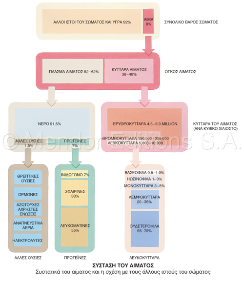 λιπίδια. Τα κυτταρικά στοιχεία αποτελούνται από τα ερυθροκύτταρα (ερυθρά αιμοσφαίρια), τα λευκοκύτταρα (λευκά αιμοσφαίρια) και τα θρομβοκύτταρα