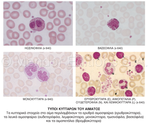 (αιμοπετάλια). Τα λευκοκύτταρα αποτελούνται από ουδετερόφιλα, ηωσινόφιλα, βασεόφιλα, λεμφοκύτταρα και μονοκύτταρα.