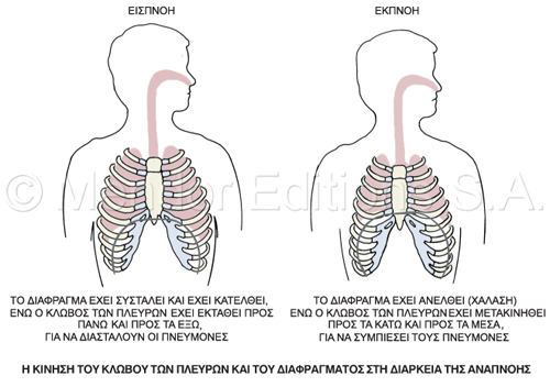 επάνω. Συσπάται για να προωθήσει την εισπνοή, πλατύνει προς τα κάτω και επιτρέπει την έκπτυξη των πνευμόνων. Χαλαρώνει για να προωθήσει την