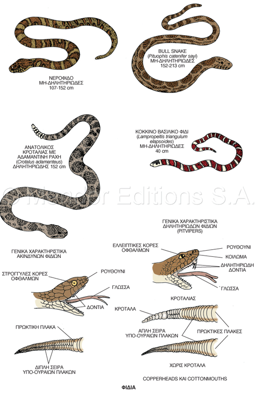 σιαγόνα. Στις HΠΑ, στα δηλητηριώδη φίδια συγκαταλέγονται τα coral snakes (Elapidae), copperhead (Agkistrodon contortrix), water moccasin ή cottonmouth
