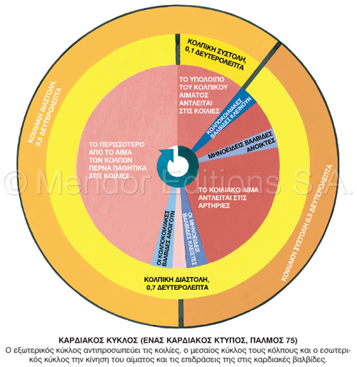 λεπτό σε ενήλικα σε ηρεμία. Η κολπική συστολή διαρκεί 0,1 δευτερόλεπτα, η κοιλιακή συστολή 0,3 δευτερόλεπτακαι η διαστολή 0,4 δευτερόλεπτα. Παρ ότι