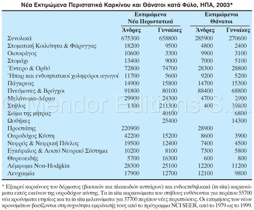 Βλ.: πίνακα (εκτιμώμενα νέα περιστατικά καρκίνου και θανάτων κατά φύλο, HΠΑ, 2003).