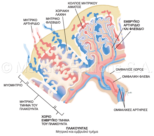 ΑΝΑΤΟΜΙΑ: Ο πλακούντας αποτελείται από το εμβρυϊκό τμήμα, το λαχνωτό χόριο, το οποίο φέρει πολλές χοριακές λάχνες και συνδέεται με τον βασικό